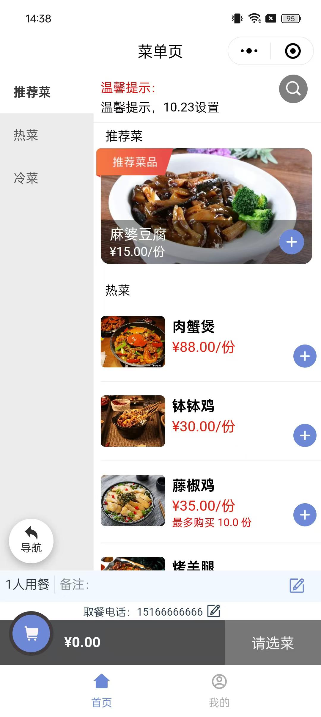 11、 营业点设置点菜提示语后在菜单会以跑马灯的形式展示提示信息。(如图 2.1.1.1-43