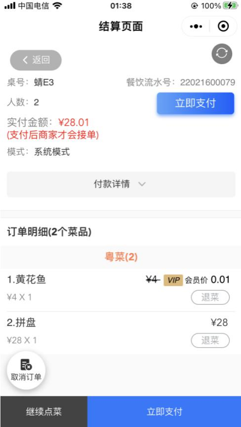 除了不会跳转到人数选择页面外,其余与老 UI 启用餐人数后付模式一致,此处不再赘述。