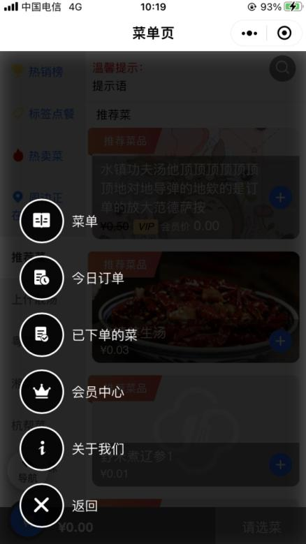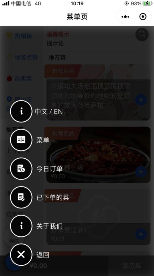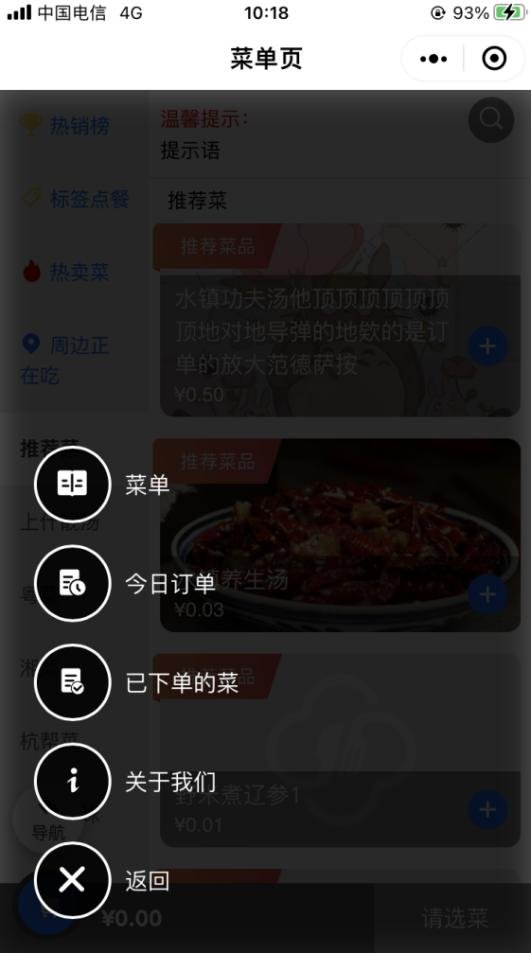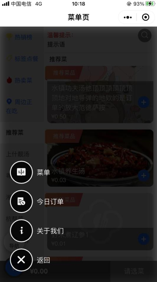 老 UI 当未下单的情况下点击〖导航〗显示〖菜单〗〖今日订单〗〖关于我们〗〖返回〗。