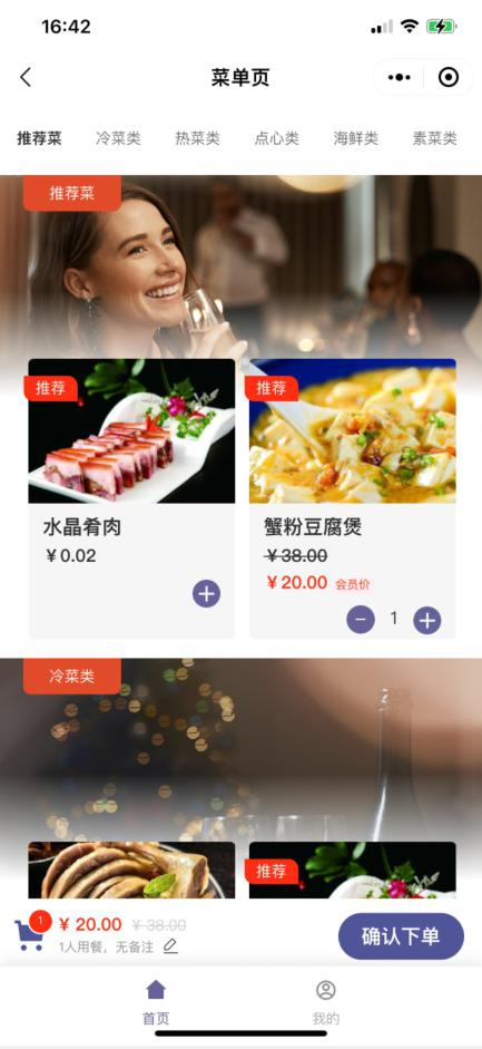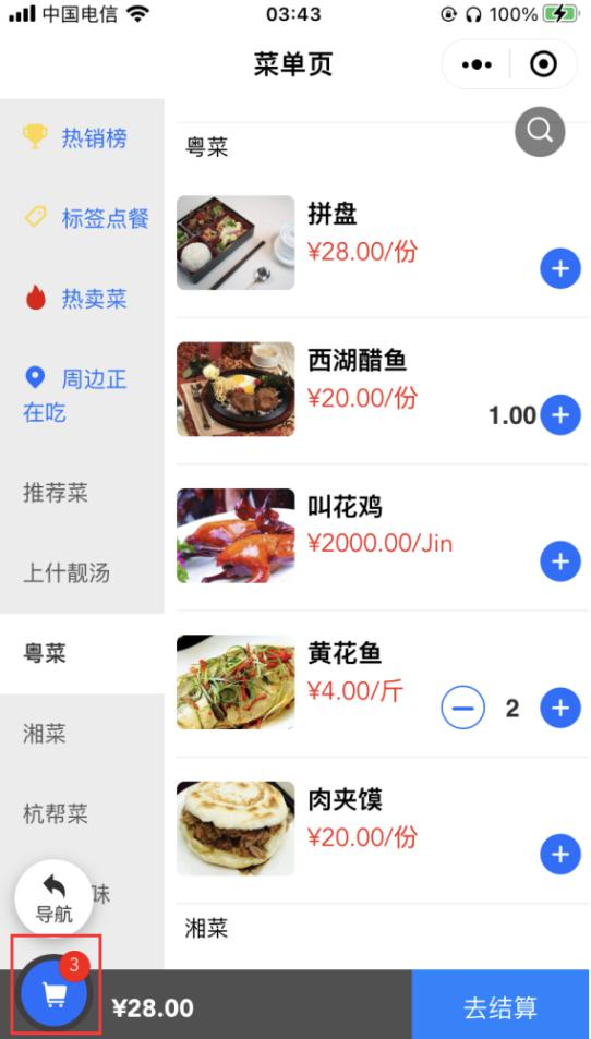 转到购物车页面(如图 2.1.6-1 所示);外卖样式下当点菜后未下单的菜会显示数字角标,