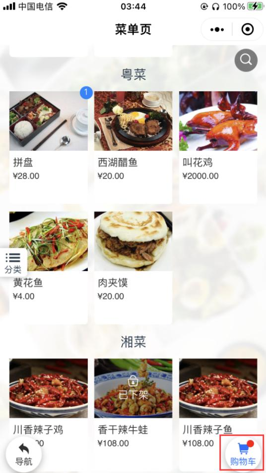老 UI 在经典样式下当点菜后并未下单的菜会显示小红点,可以通过点击〖购物车〗跳