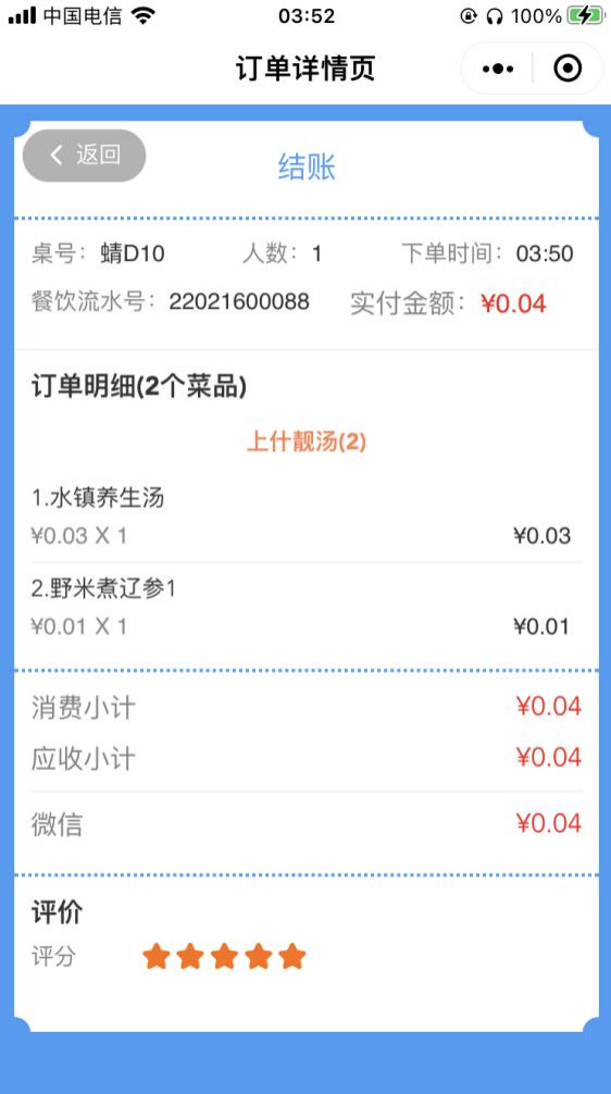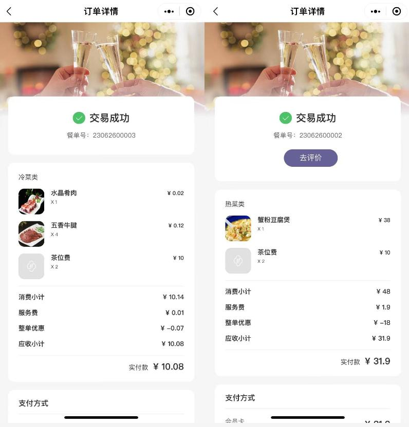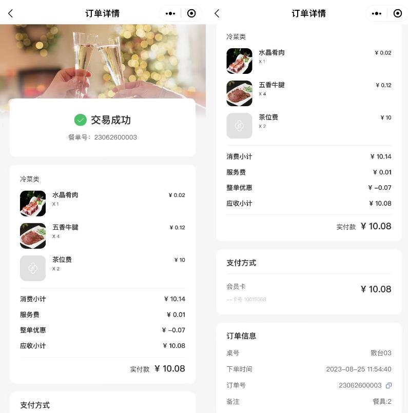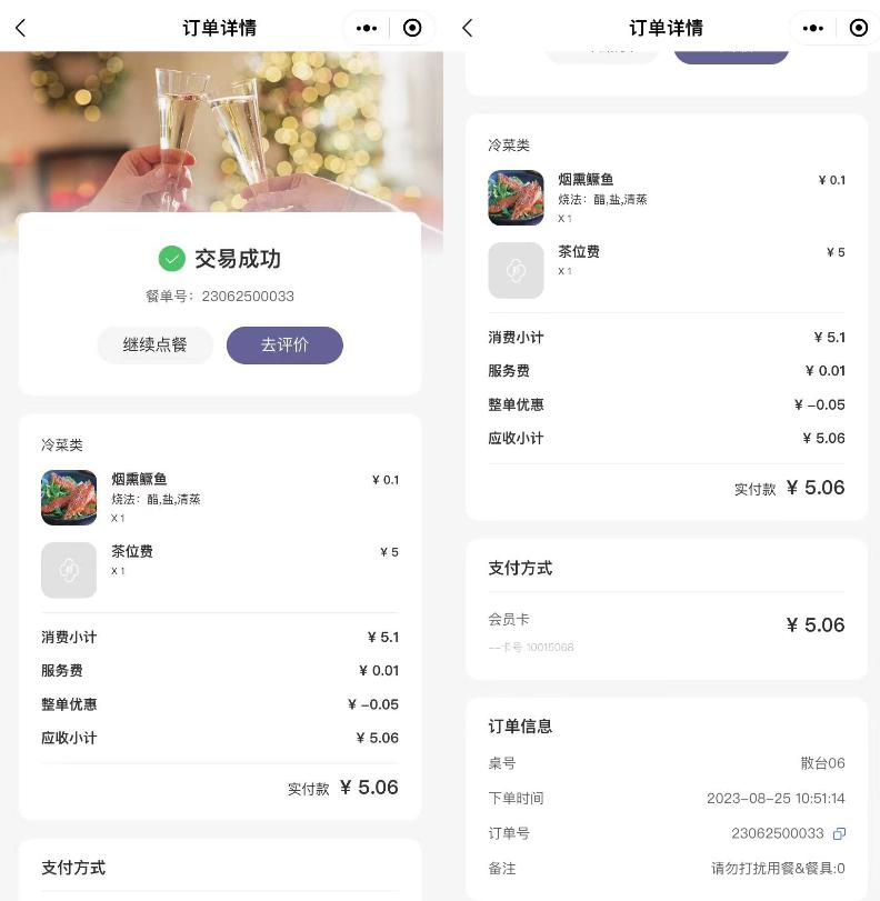 2、 若为结账成功后自动跳转至订单详情页,则餐单顶部信息显示〖继续点餐〗及〖去