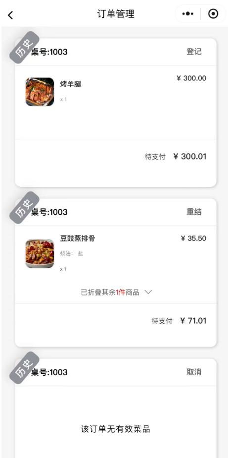 订单状态包含:登记、取消、结账、重结。点击订单可进入订单详情页。