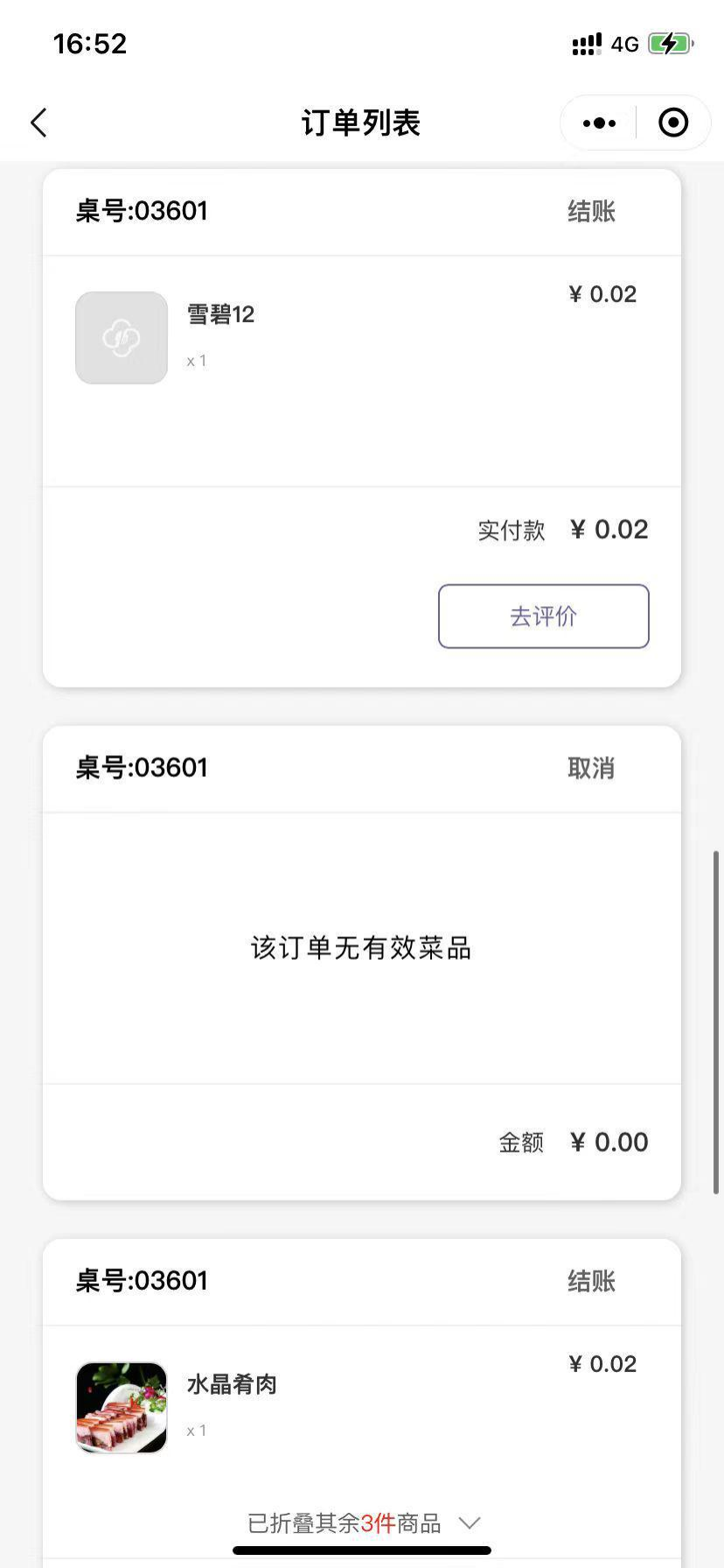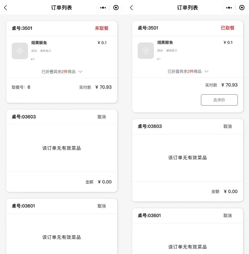 扫码模式为一台多单且开启取餐核销的餐单,若餐单未取餐则订单列表无〖去评价〗按