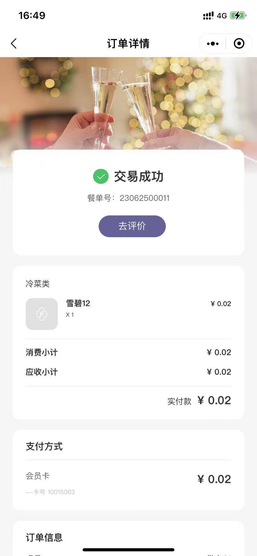 扫码模式为一台多单且开启取餐核销的餐单,订单详情页显示为取餐信息,无〖去评价〗