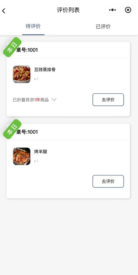 订单列表结账但未评价状态的餐单显示〖去评价〗按钮,点击可跳转至评价页面。
