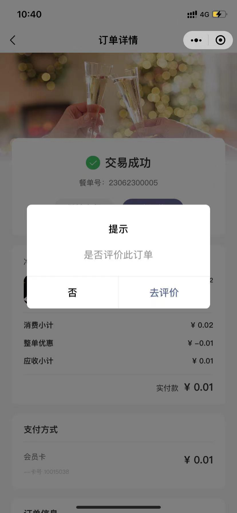餐单结账完成后,弹出是否评价提示(如图 2.1.11.1-1 所示)。