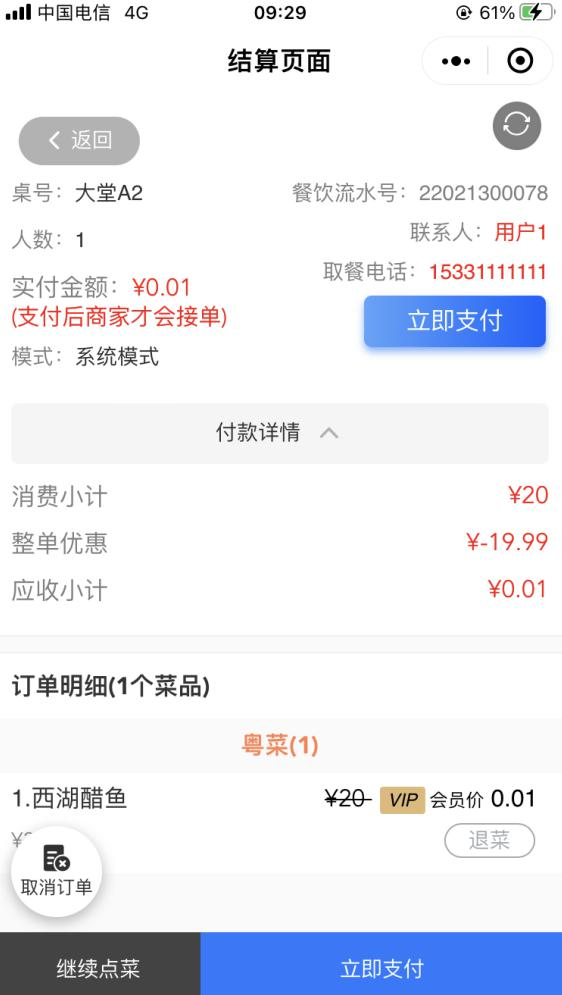 页将显示联系人和手机号码。否则,结算页面不显示取餐电话和联系人。(如图 2.2.4-1,2.2.4-2 所示)