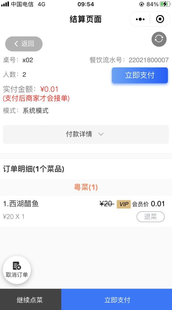 1 若营业点开启〖外卖配送〗按钮(详见章节1.3.5营业点),结算页面和订单详情
