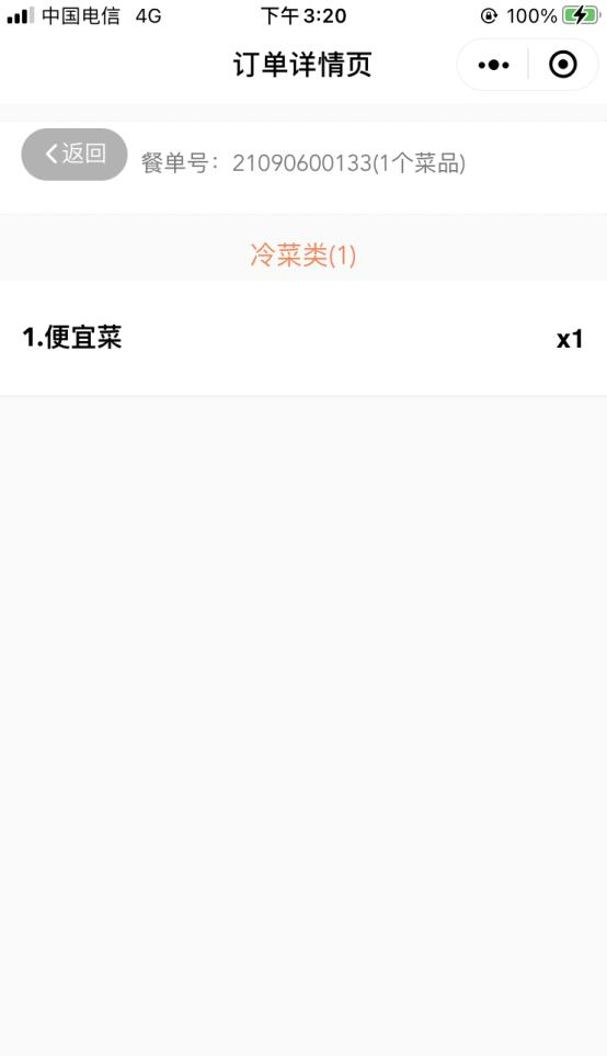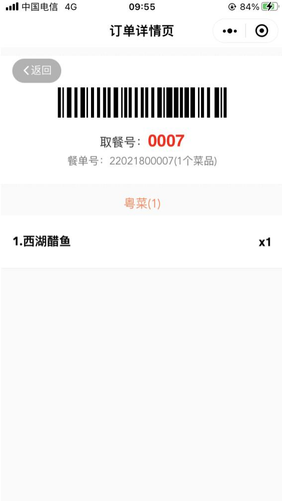 订单详情页显示餐单号以及菜品详情。(如图 2.2.6-4 所示)