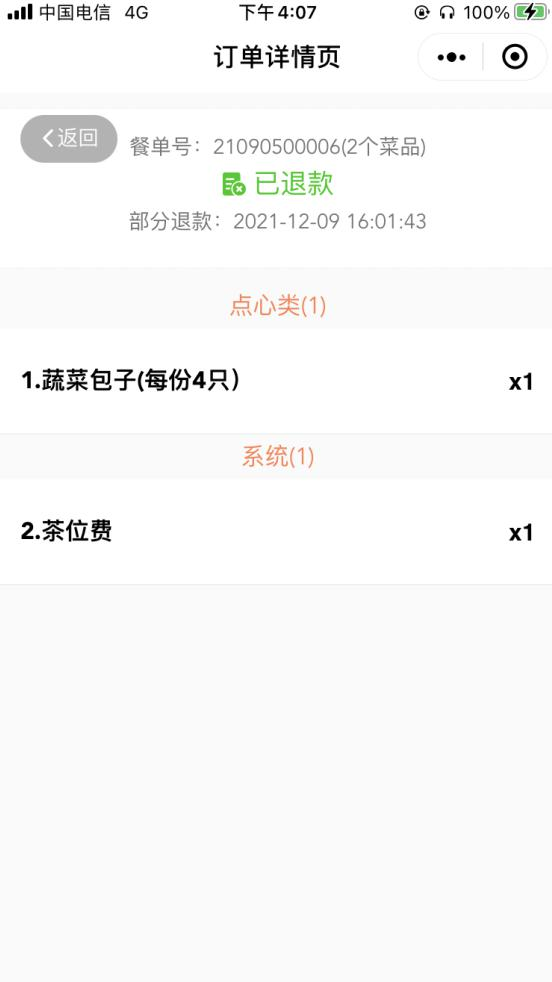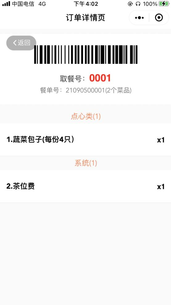 5、 点击已支付餐单进入订单详情页,餐单信息显示取餐号,与一台一单不同,不显示
