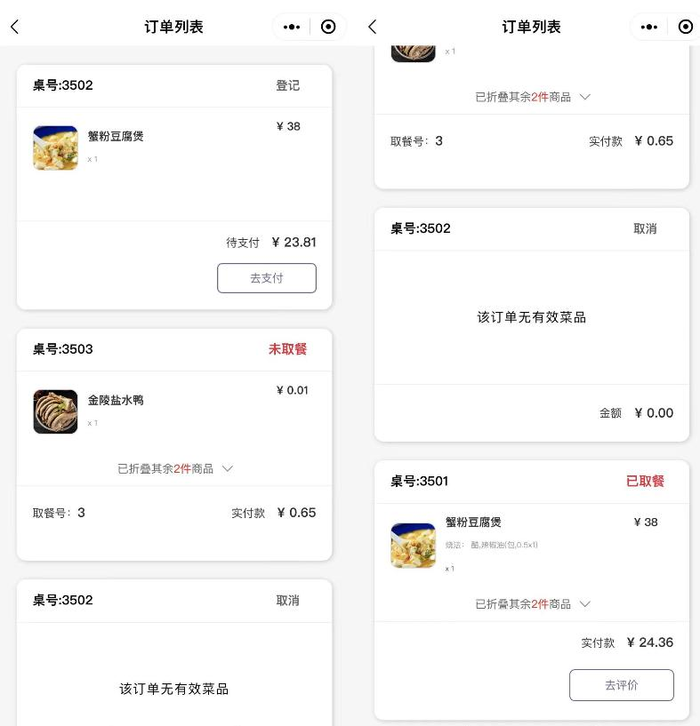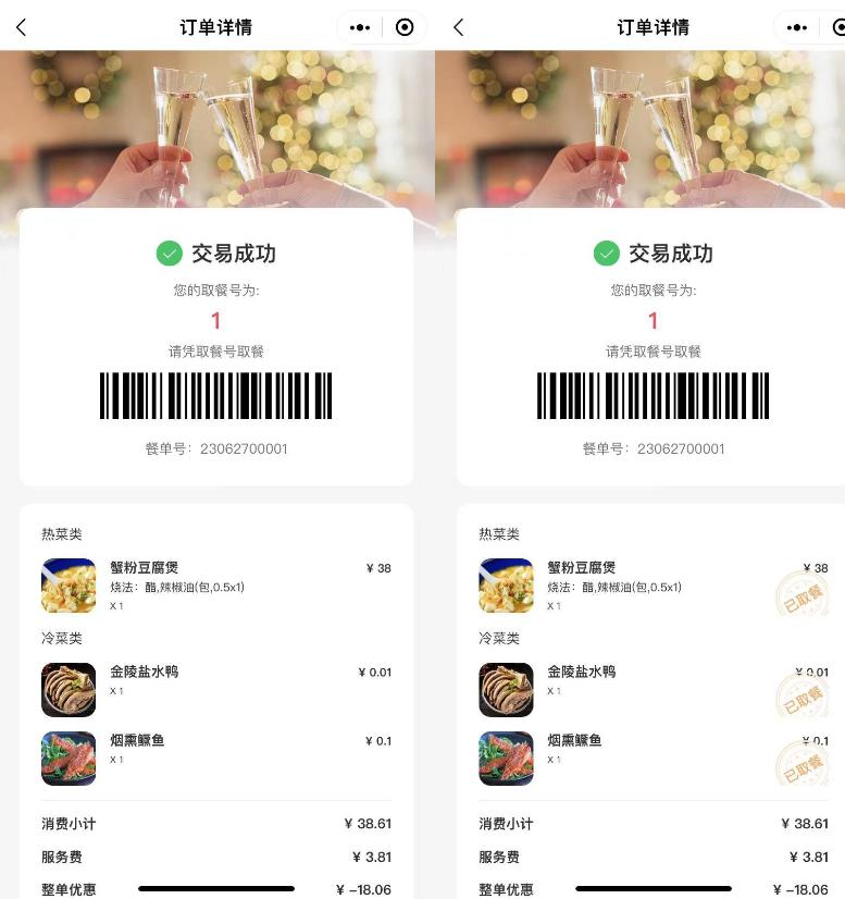 2、 未取餐餐单显示未取餐标记以及取餐号,已取餐餐单显示已取餐标记。