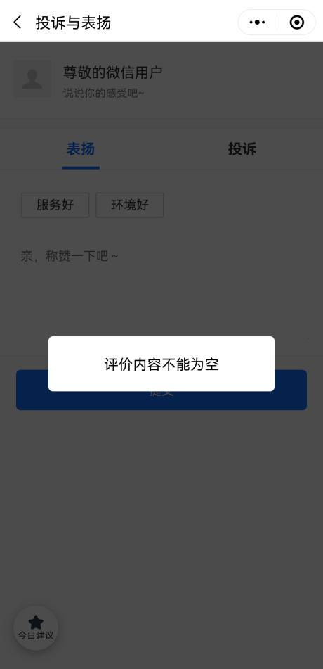 1、 当不选择表扬投诉的标签时,须输入建议内容方可提交,反之会有相应的提示(如图 2.3.5-5 所示)