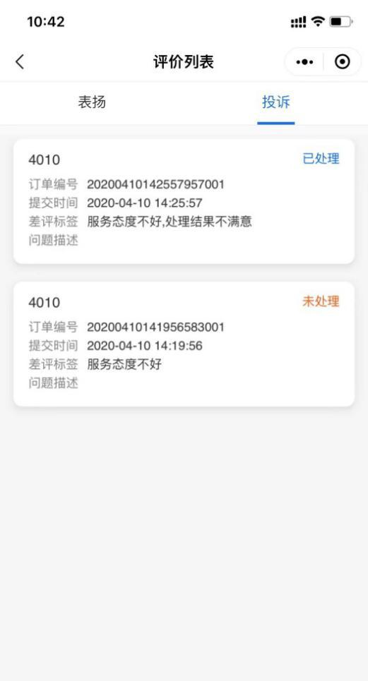 2、 投诉分为已处理的投诉蓝色字体显示“已处理”状态,未处理的红色字体显示“未