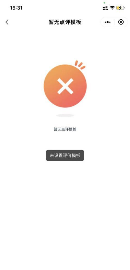 则小程序首页点击【酒店评价】功能入口,进入『酒店评价』窗口,提示暂无点评模板(如图 2.3.9-2 所示)。