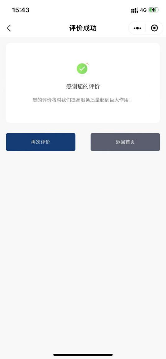 完成评价后,跳转至评价成功页,点击〖再次评价〗进入评价表页可再次评价,点击〖返