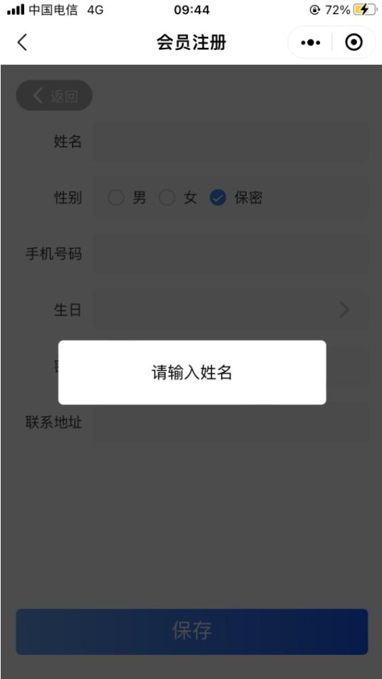 1、 会员注册时姓名、手机号和密码是必填项。若未填写,点击〖保存〗,将出现提示。(如图 2.3.8.1-4 所示)