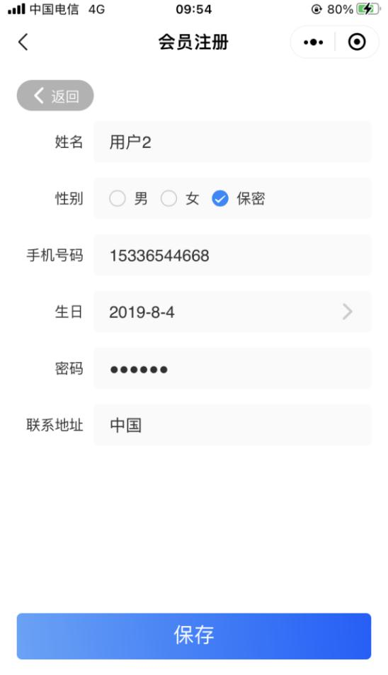 (2)、输入【姓名】、【性别】、【手机号码】、【密码】等信息,输入后点击〖保存〗,即可注册成功,