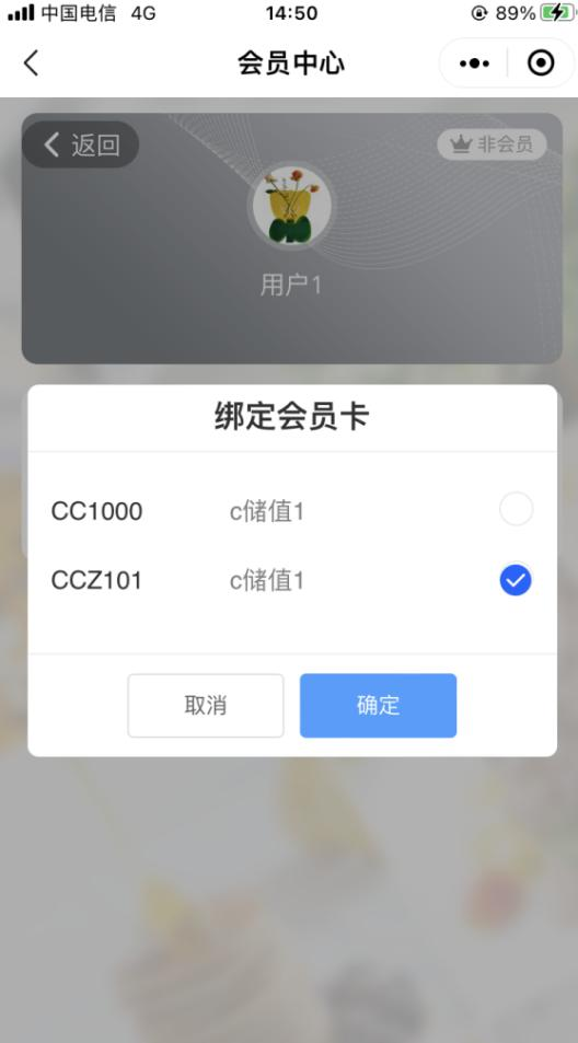 1、 已绑定会员卡时,点击已绑定会员卡,能够跳出会员卡列表,选择会员卡并点击〖确定〗,