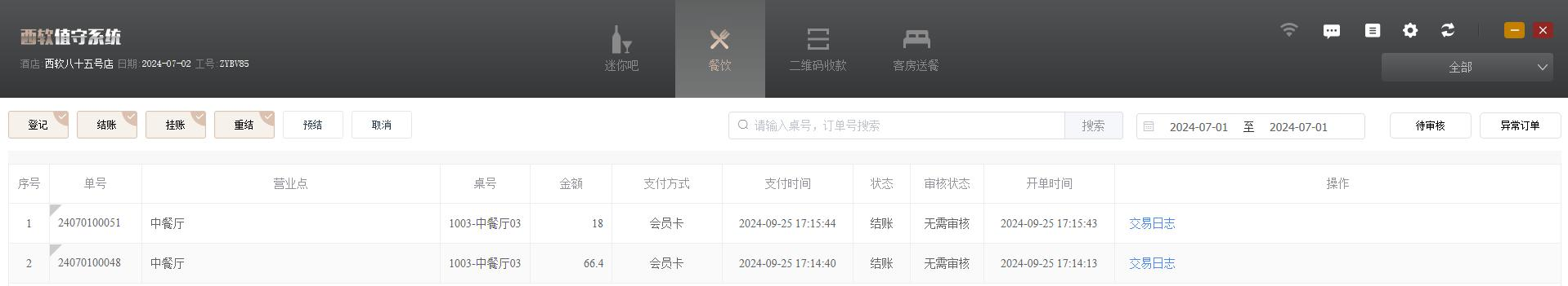 主界面左上方显示当前登录的酒店、PMS 的营业日期及登录工号;中间显示关注模块,