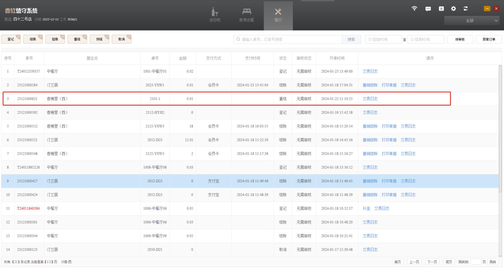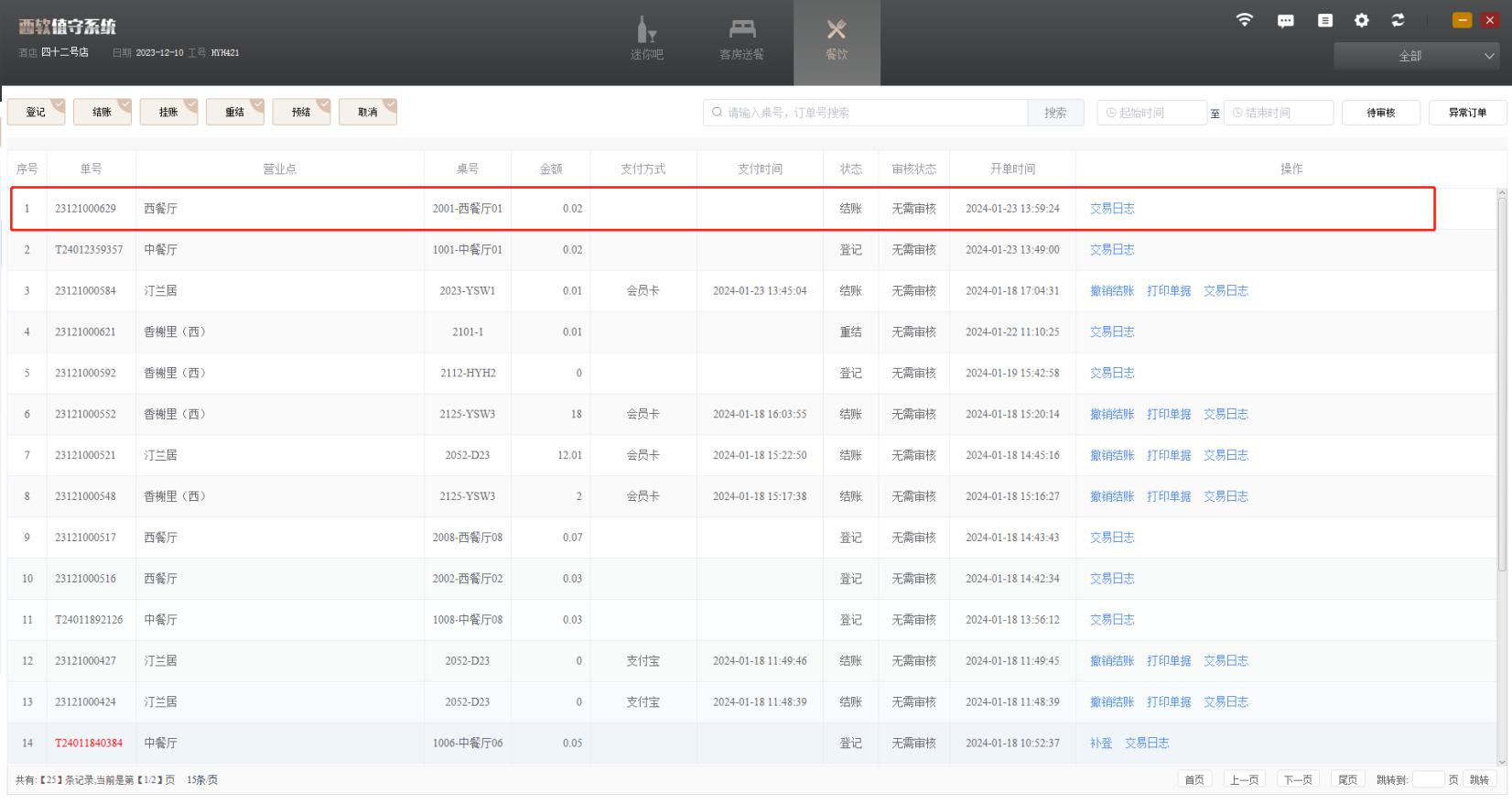 1、 若餐单是在 PMS 中进行结账的,值守列表也会同步更新,但是值守的餐单列表中