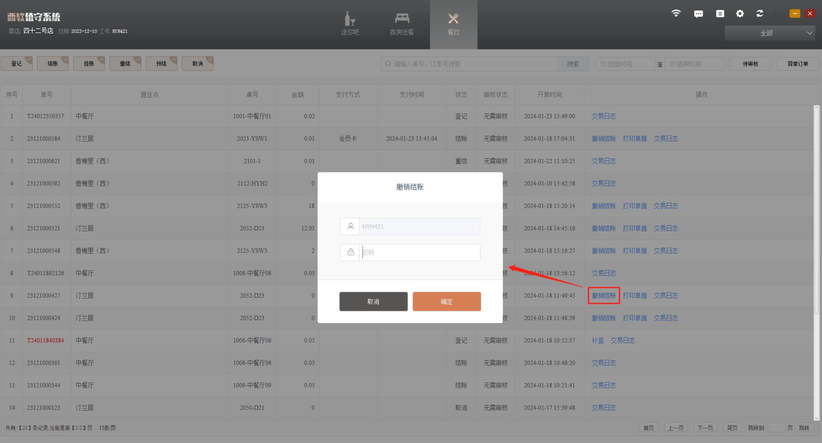 撤销结账,此注意项仅适用于送餐及餐饮模块的撤销结账功能,迷你吧模块撤销结账需确保