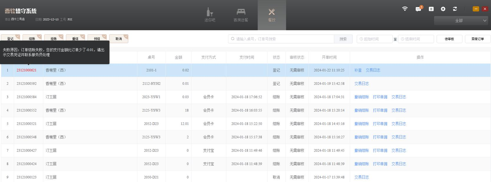 当订单出现异常的情况时,该单变为异常订单,餐饮订单列表单号红字显示,鼠标移至
