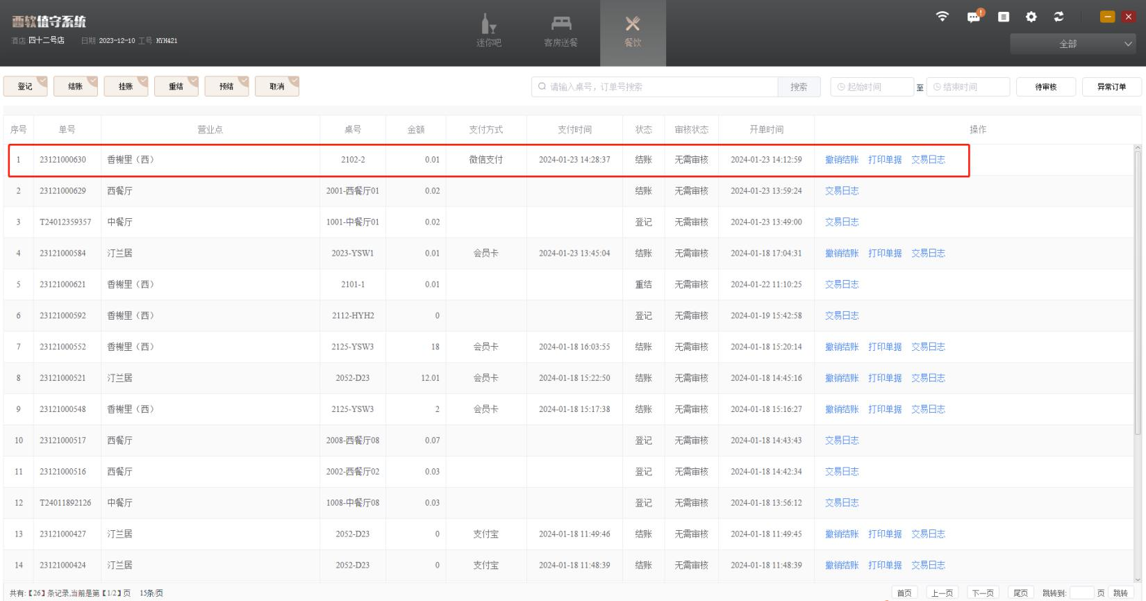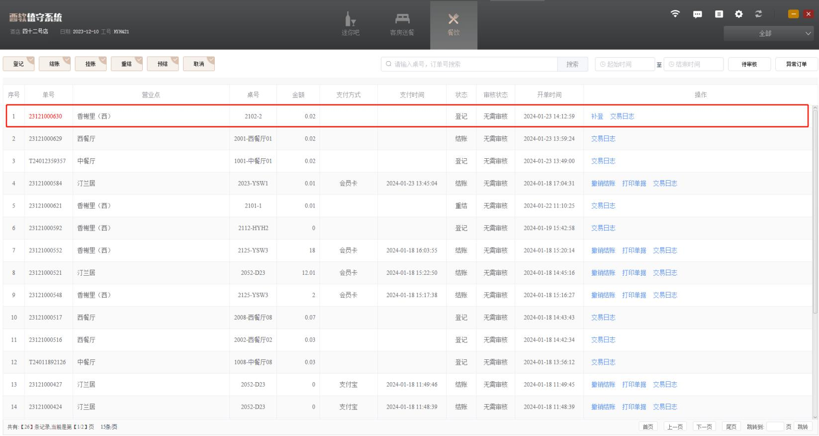 (5) 、值守点击〖补登〗按钮,餐单状态变为结账状态,正确显示支付信息且可完成撤