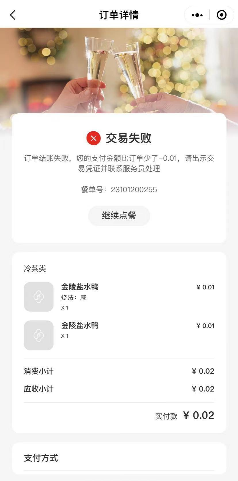 (2) 、客人支付成功,小程序订单详情显示交易失败及其原因(如图 2.5.5.6-1 所示)。