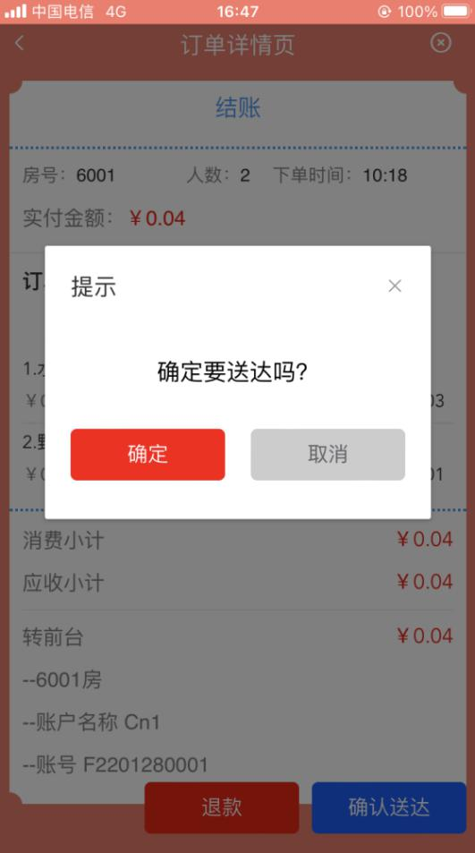 确认送达:线下服务人员已送餐至客人房间,此时需点击〖确认送达〗按钮,提示确认