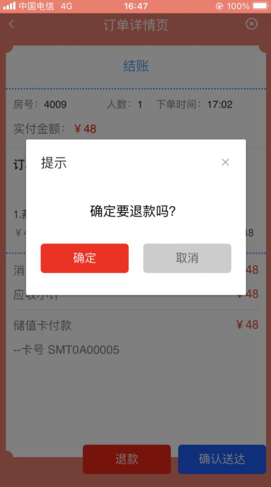 1、 针对 PMS 结账的订单,app 管理端无法进行退款(如图 2.6.1-6 所示)