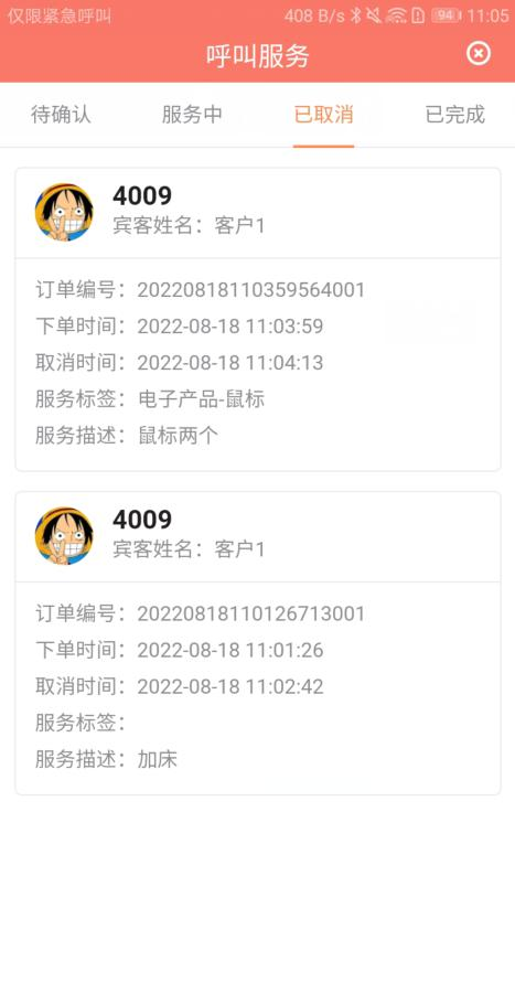服务中、已取消和已完成的服务订单(如图 2.6.3-1 所示)