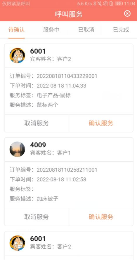 点击〖确认服务〗按钮,提示确认成功后跳转到服务中列表,增加显示已确认的订单。