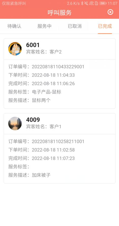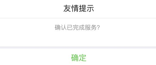 提示确认已完成服务,点击〖确认〗按钮,跳转至已完成列表,列表增加显示完成服务的订