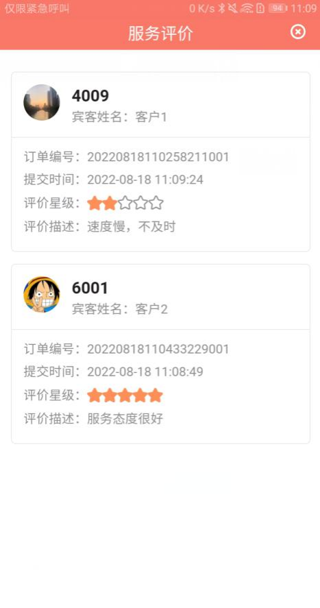 首页点击〖服务评价〗,进入服务评价页面,可查看今日所有服务评价(如图 2.6.4-1所示)