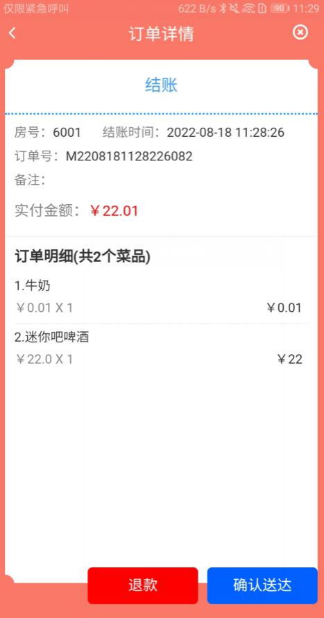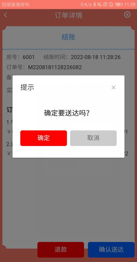 确认送达:线下服务人员已送单至客人房间,此时需点击〖确认送达〗按钮,提示确认