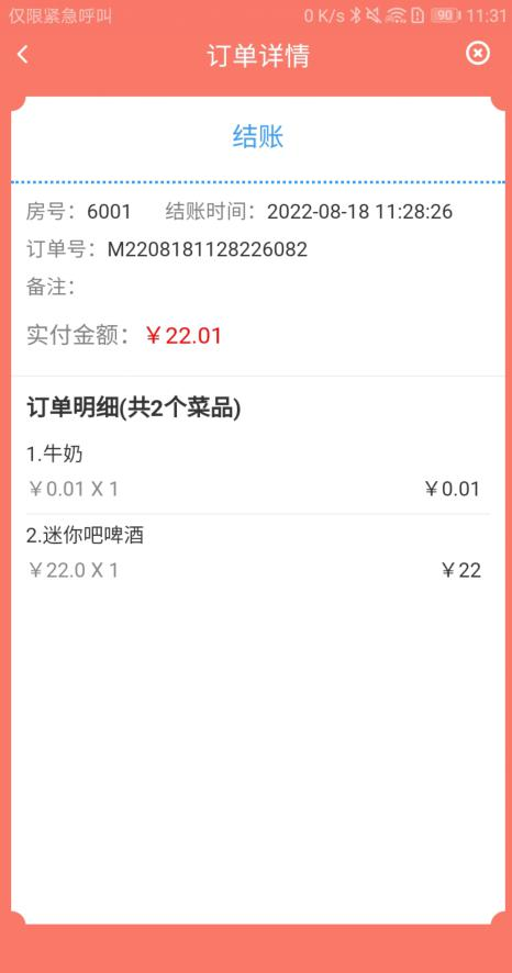 当住店客人迷你吧支付成功后在掌讯通即可收到迷你吧送餐的消息。