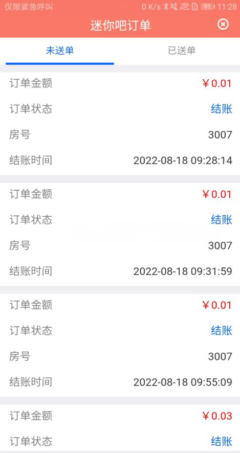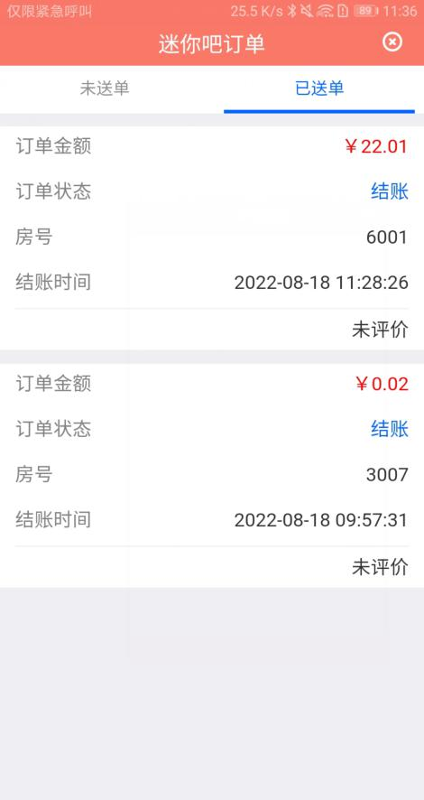 首页点击〖迷你吧〗按钮,即可进入迷你吧订单页面,可查看所有未送单和已送单的迷