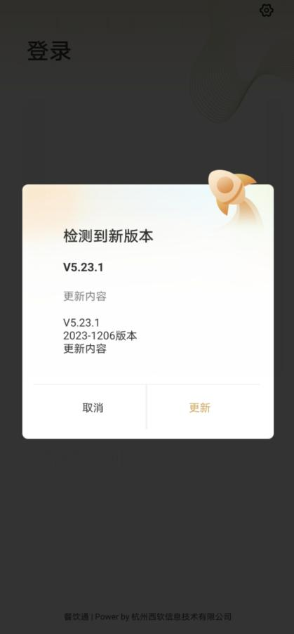 若检测到新版本,且为非强制更新,点击〖登录〗后,将跳出『版本更新』窗口。(如图 2.2-3 所示)点击〖暂不更新〗,窗口关闭,版本不更新,跳转至『选择营业点』界面或『台位图』界面;点击〖立即更新〗,窗口关闭,版本更新,更新后,点击〖登录〗,跳转至『选择营业点』或『台位图』。