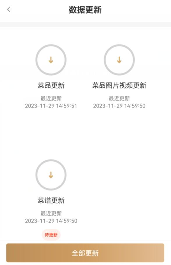 全部更新:点击此按钮,菜品、图片视频、菜谱数据均进行更新。