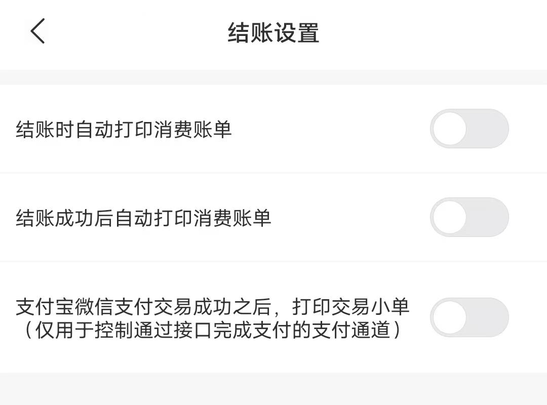 结账成功后自动打印消费账单:默认关闭。若开启该设置,APP 完成跳转到『收款成功』页,会自动打印消费账单。