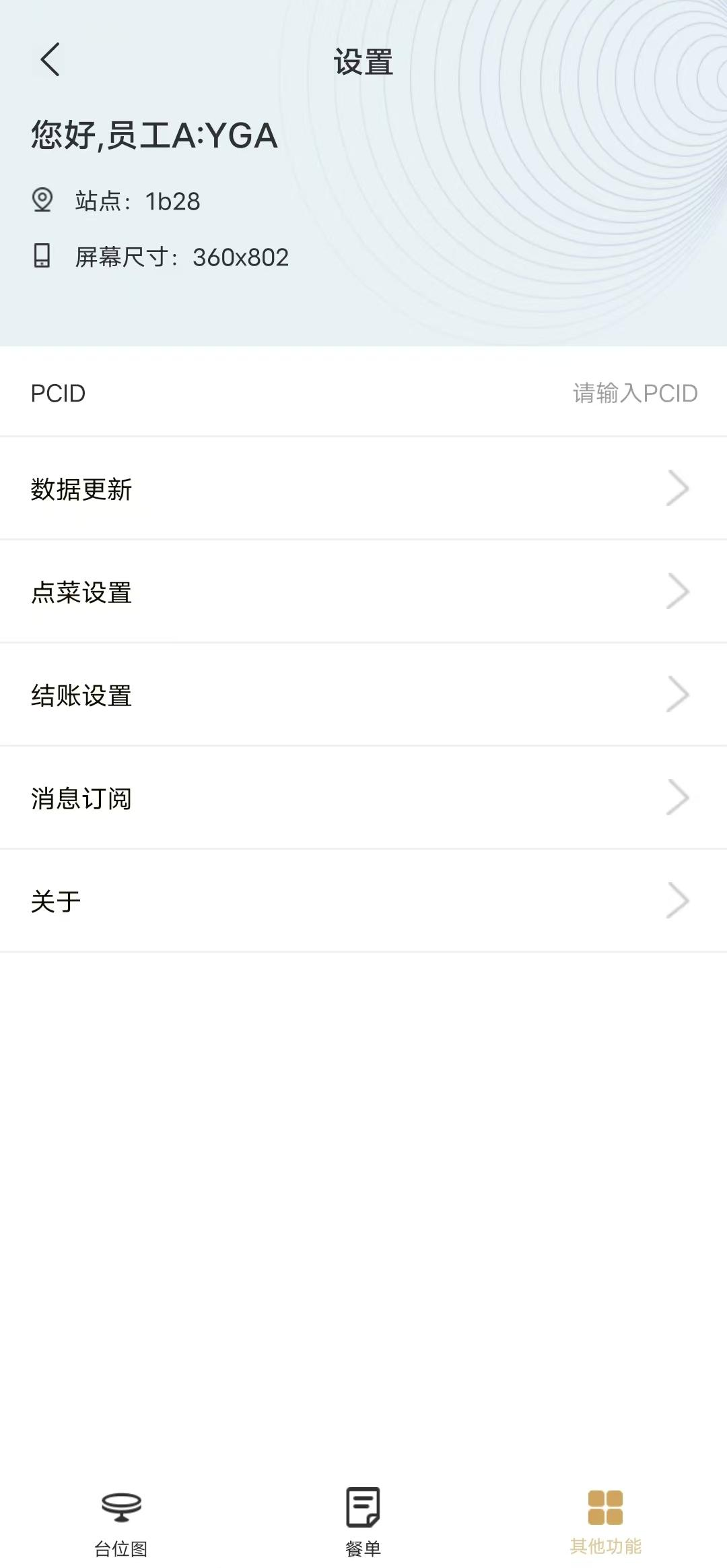 在登录餐饮通后,需要对 PCID 等参数进行设置。在『其他功能』页点击〖设置〗即可跳转至『设置』页(如图 2.1.2-1 所示)。可查看当前登录的工号、姓名,设备站点及当前设备的屏幕尺寸,进行数据更新等操作。