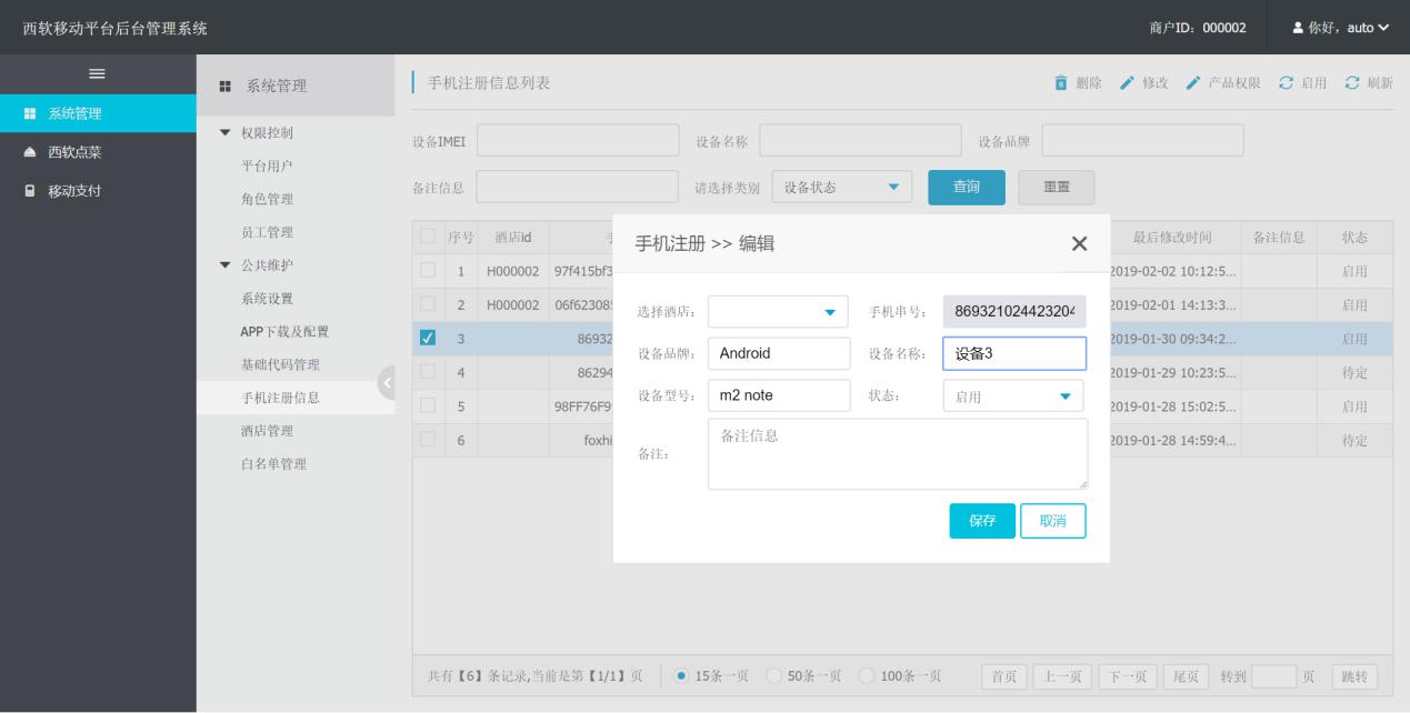 修改手机注册信息:选中需要修改的手机注册信息(不可多选),点击【修改】,