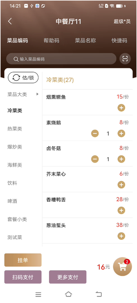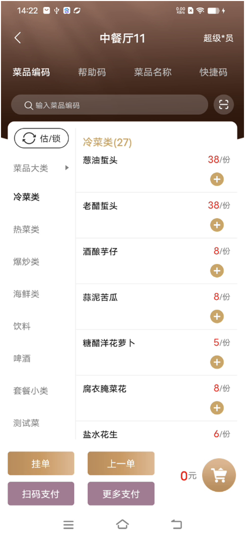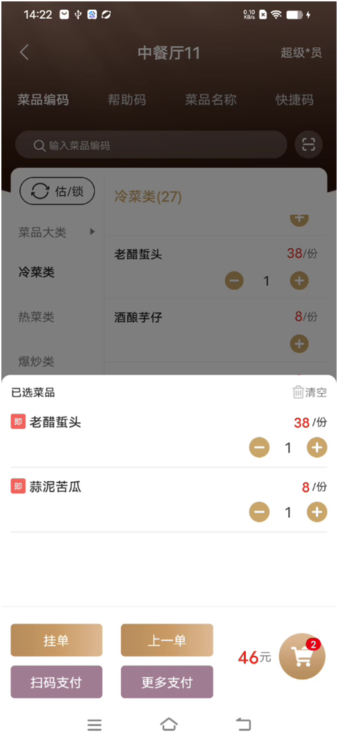1 挂单功能:当一个客人还没有收银完成,例如还在考虑要不要加别的菜时,服务员需要为下一个客人点单,此时可以点击挂单按钮,将前一个客人的菜品挂起,为下一个客人进行点单结账。结账完成后,点击按钮上一单,来加载上一个挂单的菜品。如果有多个挂单,点击上一单按钮会出现列表,此时需要服务员通过挂单时间、菜品数量、金额来选择。