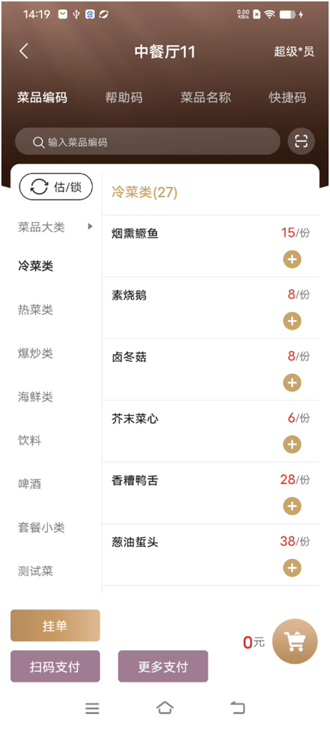 2.1 app点击台位图的入单结账按钮进入点菜页面。