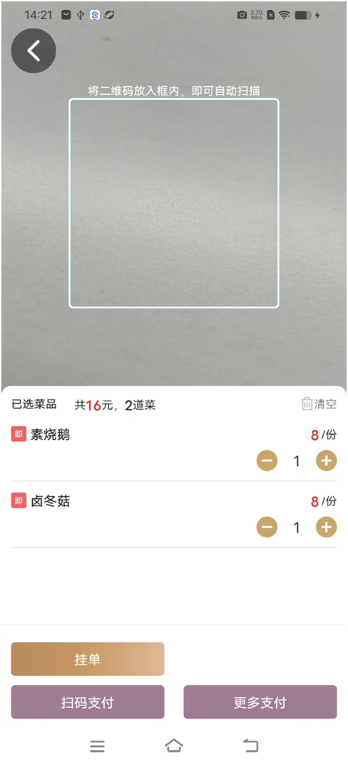 2.3 点击扫码支付后,打开付款码扫码页面,使用设备的摄像头扫客人的支付宝或者微信的付款码,会自动将菜品送单并使用支付宝或者微信进行结账。结账完成后,页面仍停留在点菜页面,可以继续为下一个人点单。