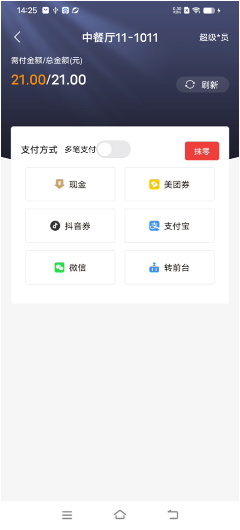 2 使用其他支付方式支付:如果客人要求不使用支付宝或者微信进行结账,可点击更多支付,进入结账页面,选择别的支付方式进行结账。