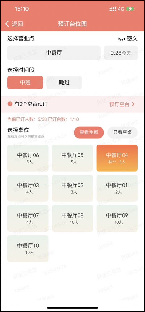 - 显示当前空台预订订单数、总人数、已订人数、总台数、已订台数,可以理解为当前营业点在当前时间段的预订情况