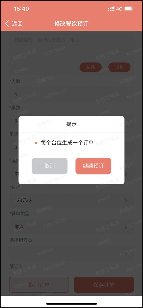 在新建预订和修改预订单,在多选了台位后,可根据参数配置,进行拆分订单并联单;