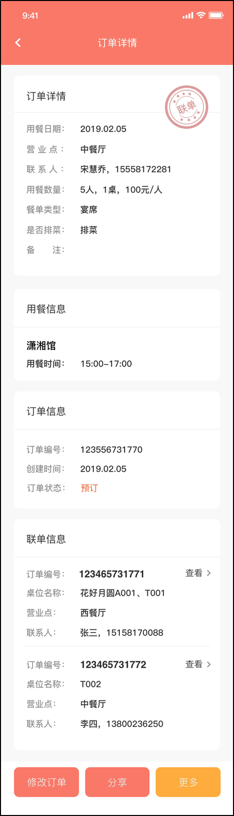 2.餐饮预订新建、修改餐单时支持联单,并支持在对应餐单详情下显示联单信息